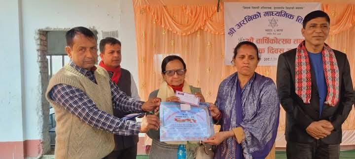 भद्रपुर । माघ २६ गते विशेष दिन बनाउने क्रममा भद्रपुर ३ सूर्य नगरमा रहेको अरनिको माध्यमिक विद्यालयका प्रधान अध्यापक पुरूषोत्तम खरेलले उत्कृष्ट विद्यार्थी सम्मान कार्यक्रम गरेका छन् ।