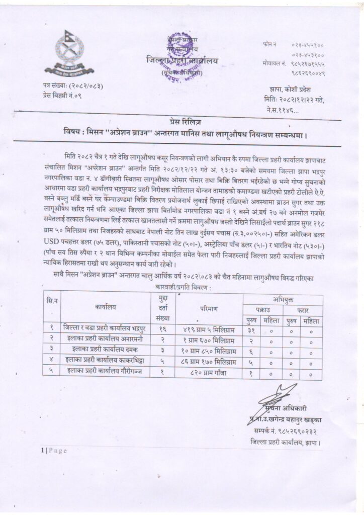 भद्रपुर, झापा — जिल्ला प्रहरी कार्यालय झापाले लागूऔषध विरुद्ध सञ्चालन गरिरहेको “मिसन अपरेशन ब्राउन” अन्तर्गत २१८ ग्रामभन्दा बढी ब्राउन सुगरसहित दुई जनालाई पक्राउ गरेको छ।