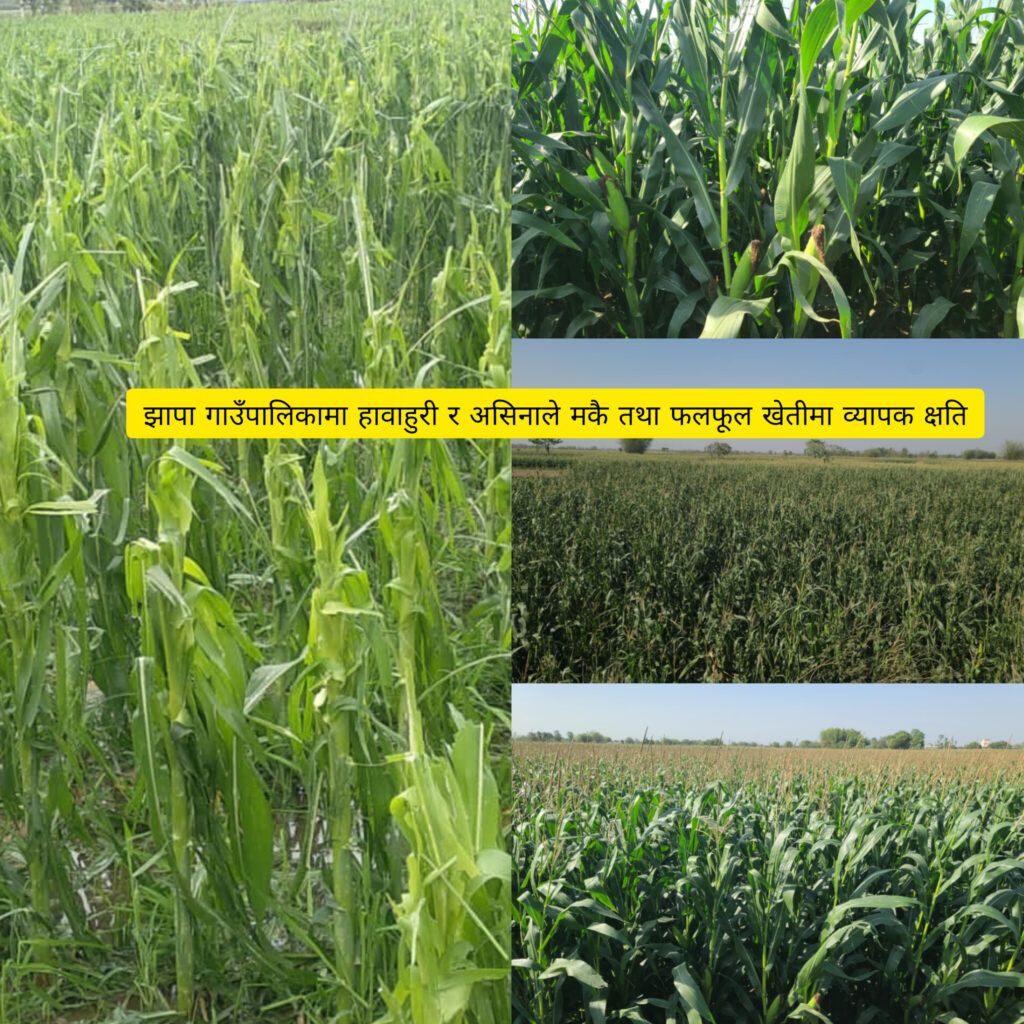 नेत्र बिक्रम बिमली : झापा । झापा गाउँपालिकामा गत फागुनको अन्तिम सातादेखि चैतको दोस्रो सातासम्म आएको हावाहुरी, असिना तथा वर्षाले मकैबाली र फलफूल खेतीमा करोडौं रुपैयाँ बराबरको क्षति पुगेको छ। गाउँपालिका कृषि शाखाका अनुसार पालिकाभित्रका सातै वडामा लगाइएको करिब ४ हजार ८१० हेक्टर क्षेत्रफलको मकैबाली प्रभावित भएको छ।