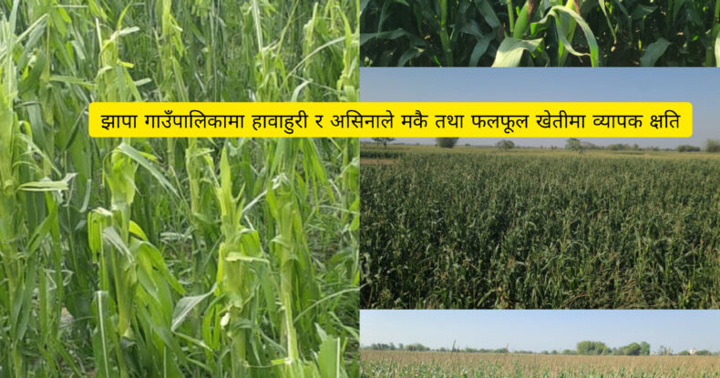 नेत्र बिक्रम बिमली : झापा । झापा गाउँपालिकामा गत फागुनको अन्तिम सातादेखि चैतको दोस्रो सातासम्म आएको हावाहुरी, असिना तथा वर्षाले मकैबाली र फलफूल खेतीमा करोडौं रुपैयाँ बराबरको क्षति पुगेको छ। गाउँपालिका कृषि शाखाका अनुसार पालिकाभित्रका सातै वडामा लगाइएको करिब ४ हजार ८१० हेक्टर क्षेत्रफलको मकैबाली प्रभावित भएको छ।