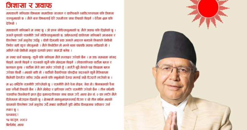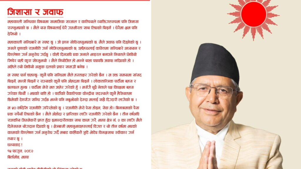 झापा, नेपाल: झापा क्षेत्र नं. २ का प्रतिनिधिसभा सदस्यका उम्मेदवार देवराज घिमिरेले महाकाली सन्धि सम्बन्धमा हालै सामाजिक सञ्जालमा उठेका प्रश्न र प्रचार सामग्रीप्रति आफ्नो स्पष्टोक्ति दिएका छन्। घिमिरेले विज्ञप्तिमा दाबी गरेका छन् कि उनले उक्त सन्धिमा कुनै पनि रूपमा हस्ताक्षर गरेका छैनन्।