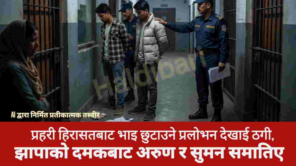 घटनाको विवरण अनुसार, गत फागुन २५ गते झापाको कमल गाउँपालिका वडा नं. ६ गुवाबारीबाट लागूऔषध (खैरो हिरोइन) सहित लक्ष्मण राजवंशी पक्राउ परेका थिए। निज लक्ष्मणमाथि लागूऔषध नियन्त्रण ऐन २०३३ अन्तर्गत अनुसन्धान भइरहेको अवस्थामा अरुण र सुमनले उनका दाजु रामप्रसाद राजवंशीलाई विश्वासमा पारी भाइलाई हिरासतबाट निकालिदिने भन्दै एक लाख ५० हजार रुपैयाँ ठगी गरेका थिए। पीडितले आफ्नो भाइलाई छुटाइदिने आशामा रकम बुझाए पनि ठगी भएको थाहा पाएपछि प्रहरीमा सूचना दिएका थिए।