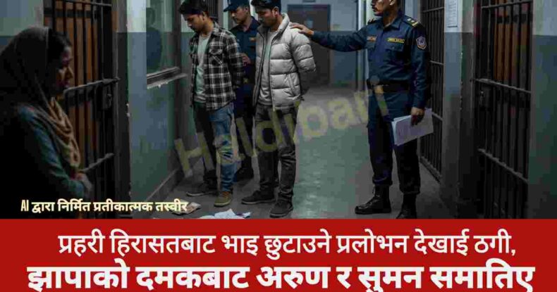 दमक, झापा । झापाको दमकमा लागूऔषध मुद्दाका अभियुक्तलाई प्रहरी हिरासतबाट छुटाइदिने प्रलोभन देखाई रकम ठगी गरेको आरोपमा दुई जना पक्राउ परेका छन्। पक्राउ पर्नेहरूमा झापाको दमक नगरपालिका वडा नं. ९ जिम्मादार चोक बस्ने ३० वर्षीय अरुण दनुवार र कमल गाउँपालिका वडा नं. ६ खैरबारी बस्ने ३२ वर्षीय सुमन खड्का रहेका छन्।