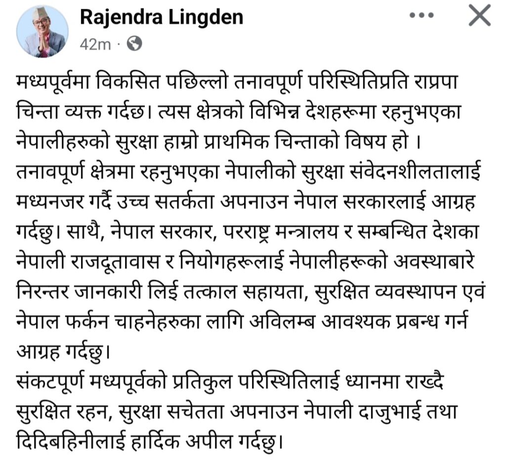 राष्ट्रिय प्रजातन्त्र पार्टी (राप्रपा) का केन्द्रीय अध्यक्ष एवं झापा क्षेत्र नम्बर ३ का प्रतिनिधि सभा सदस्य उम्मेदवार राजेन्द्र लिङ्देनले मध्यपूर्वमा विकसित पछिल्लो तनावपूर्ण परिस्थितिप्रति गम्भीर चिन्ता व्यक्त गर्नुभएको छ। उहाँले त्यस क्षेत्रमा रहेका नेपालीहरूको सुरक्षा सर्वोच्च प्राथमिकता भएको र नेपालको सरकारले उच्च सतर्कता अपनाउनुपर्ने बताएका छन्।