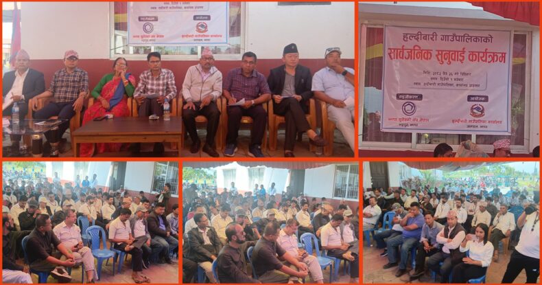 Haldibari (Jhapa): The Haldibari Rural Municipality of Jhapa has successfully conducted a public hearing program focused on ensuring good governance and transparency. Chaired by the Rural Municipality Chairperson, Rabindra Prasad Lingden, the event saw local residents raising inquiries and grievances regarding infrastructure, health, education, drinking water, agriculture, and tourism.